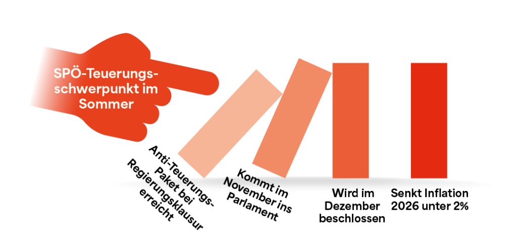 “Mit der SPÖ hat die Inflation wieder eine klare Richtung: nach unten. Politik wirkt nicht von heute auf morgen. Oder wie es Finanzminister Markus Marterbauer sinngemäß formuliert: „Es gibt keine Taste die man drücken kann mit der man die Inflation sofort ausschaltet. Es braucht eine ganze Reihe an Maßnahmen.”
